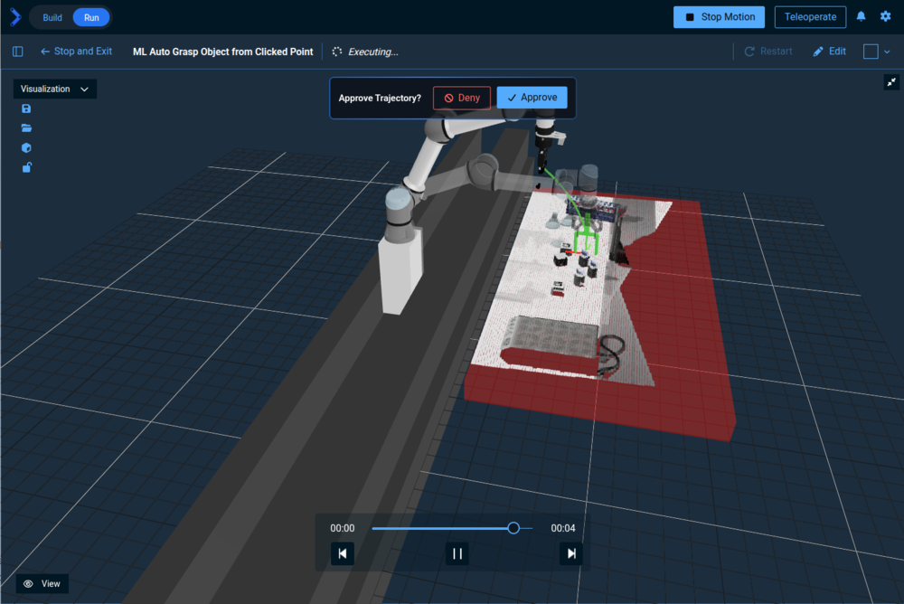 Some applications will run forever, until you tell it to stop. The 3 Waypoints Pick and Place Objective is a simple example like that - run it now. It will pick a small cube object using hard-coded waypoints forever.
