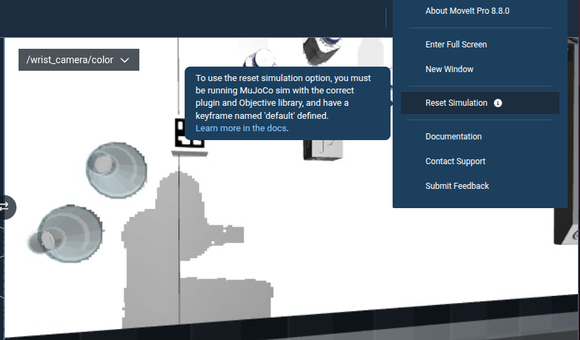 Objective to reset the scene to the "default" keyframe. ⚠️ Note: This approach will not be released until MoveIt Pro version 8.8. - Third party UI: Run the MuJoCo Interactive Viewer to reset the simulation (details in next section).